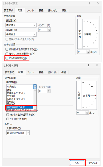1.セルの結合の解除 結合されたセルを選択し、「セルの書式設定」から配置を開き 「文字の制御」内の[セルを結合する]のチェックを下図のように外す 2.位置設定の変更 同じ「セルの書式設定」の配置にある 「文字の配置」の「横位置」を [選択範囲内で中央]に変更して右下の「OK」を押下