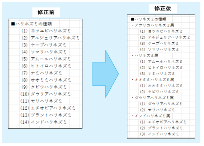 「修正後」で分類を追加して、項番を付け直す作業を行っています。